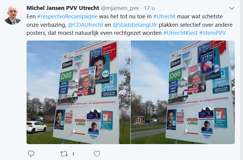 Weer typisch PVV, eerste poster in hun campagne wordt over de poster van Partij voor de Dieren geplakt (februari, foto 1). Vervolgens een maand later (maart, foto 2) verbaasd zijn dat in een “respectvolle campagne” politieke partijen over hun posters heen plakken. Stelletje dakhazen, het was al geen respectvolle campagne meer toen meneer van Deún moskeeën wou afvikken en de islam ging vergelijken met nationaal socialisme. Het was al geen respectvolle campagne meer toen de PVV een koran verbod opnam in hun verkiezingsprogramma, noch toen de PVV zei dat het alle moskeeën in Nederland wou verbieden.