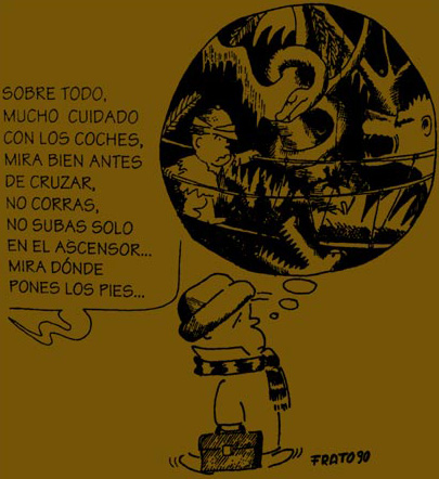 La ciudad no pertenece ya a las personas ni a los niños, ni a las niñas: la ciudad es de los coches,de las sirenas estridentes, del aire contaminado, de la violencia, del miedo.Salir de casa sol@, buscarse un amig@, organizar junt@s un juego, intercambiarse las reglas, pelearse si es necesario y volver a casa, constituye una experiencia fundamental para el crecimiento social y cognitivo del niño y niña de cuatro o cinco años.Pero actualmente eso resulta difícil incluso para un/a niñ@ de diez años o para un/a niña/o aun algo mayor.Fuera de casa ya no existe el mundo fascinante del patio, de las aceras, de las plantas o de los animales del parque.Sólo existe el peligro, la prohibición.de "la soledad del niño" y la niña, por Francesco Tonucci