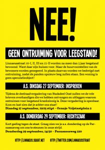 Zoals jullie wellicht weten wordt de woongroep Linnaeusstraat 70/72 bedreigd met ontruiming voor leegstand. Dit zullen wij aanvechten in een kortgeding tegen de staat op 29 september. Daarnaast voeren wij een bredere campagne in onze buurt en daarom ook bij het stadsdeel.
