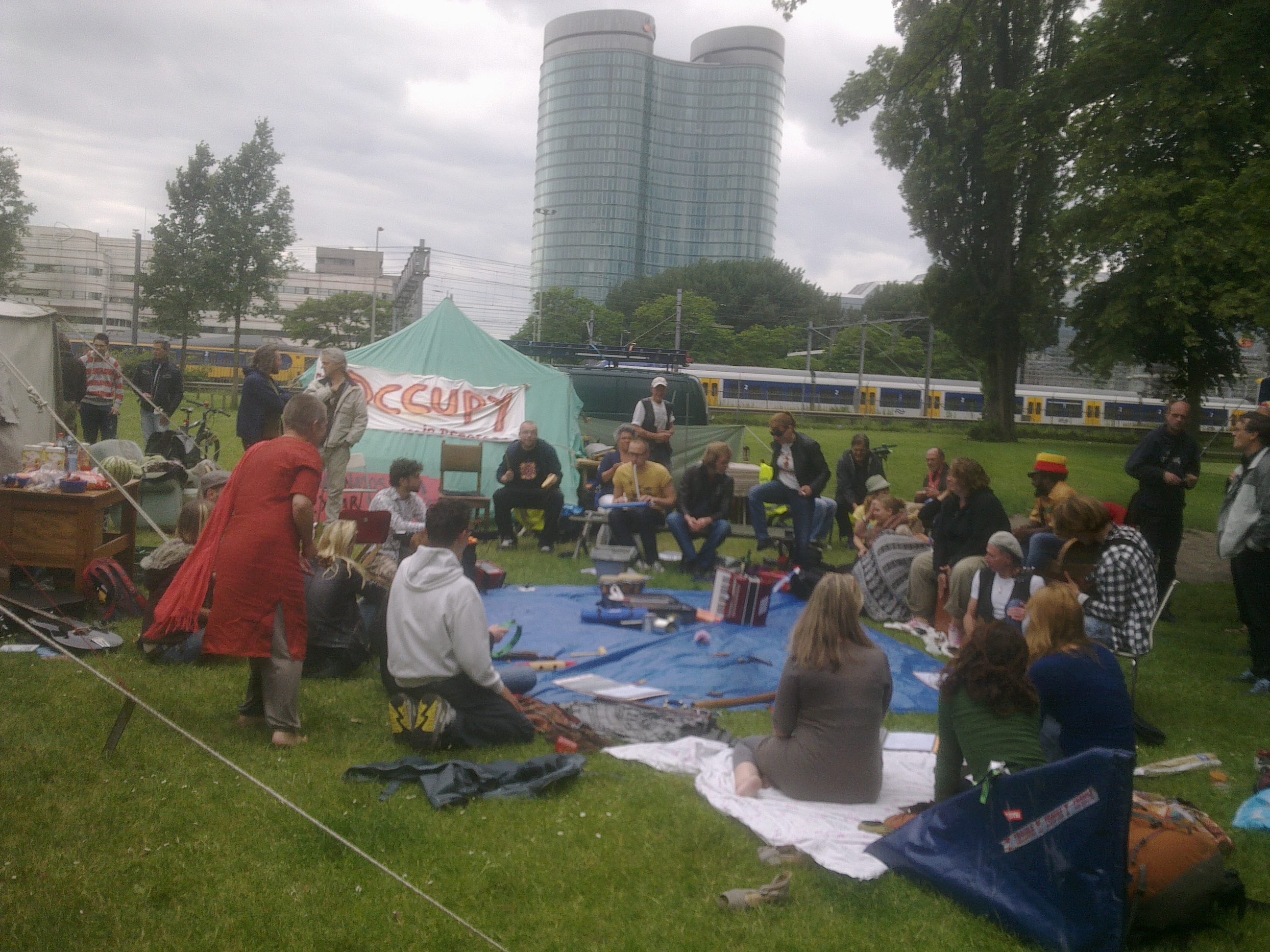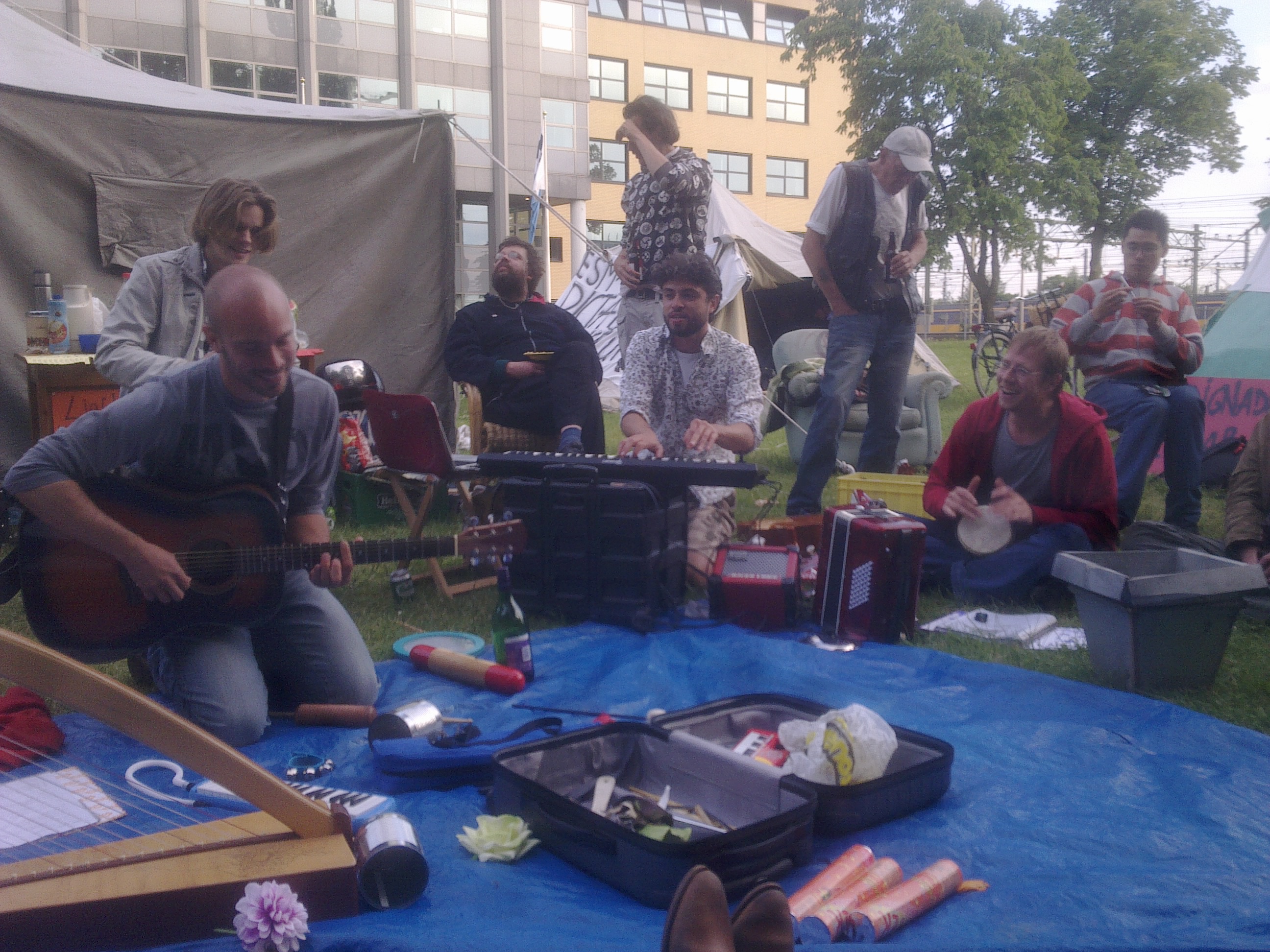 What's the best remedy to all crisis? Peace, Love and Music of course! More than 50 beautiful people attended this massive jam session at Occupy Utrecht, playing wild improvisations and songs from the 'Sing-A-Long Happy Songbook'...'We're Jammin', 'Imagine', 'Don't worry be happy'...