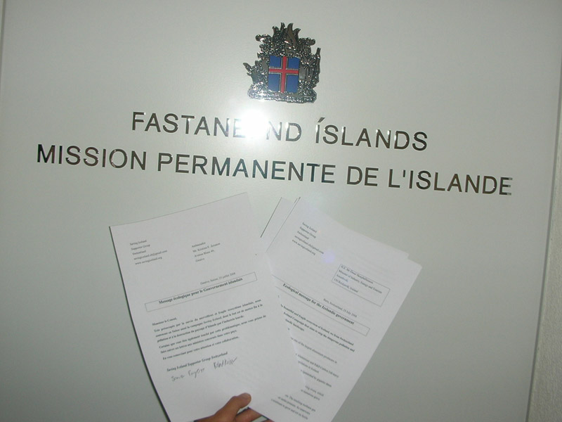 For the international action week in solidarity with the activists fighting at the camp in Iceland, some activists of the Swiss S.I. Supporters Group hand delivered a letter to the Icelandic Consuls and Ambassador in Switzerland. It contained an “ecological message for the Icelandic government” which we asked to be forwarded to the ministers for industry, the environment and economic affairs.