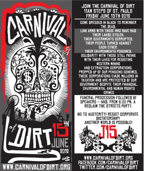 On Friday 15 June 2012, London will experience its first ever Carnival of Dirt, a carnival against London’s mining industry. More than 30 activist groups from London and around the world have come together to highlight the deeds of mining and extraction companies. All those who can make it should go!
