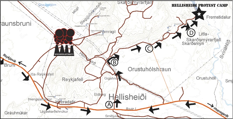 The 2008 camp for action against Iceland’s heavy industrialisation has now begun. We welcome the support of all those who want to stop the aluminium industries ongoing ecological and social destruction to join us in direct actions against them. Camp Hellisheiði can be reached by two-wheel drive vehicles and bicycles. Direct action workshops and vegan food is provided for free or donation.