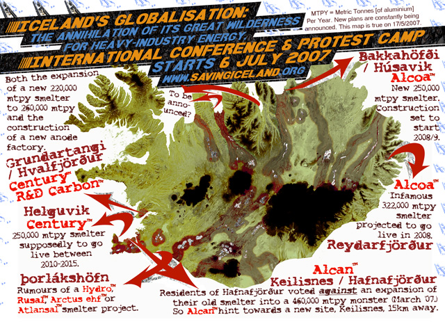 On the 12th of September 2007, the Global Day of Action Against Heavy Industry, people in South Africa, Iceland, Trinidad, Denmark, New York, Holland and the UK protested against the heavy industrialisation of our planet. This marked the first coordinated event of a new and growing global movement that began at the 2007 Saving Iceland protest camp in Ölfus, Iceland. The common target of these protests against heavy industry was the aluminium industry, in particular the corporations Alcan/Rio-Tinto and Alcoa. Read More